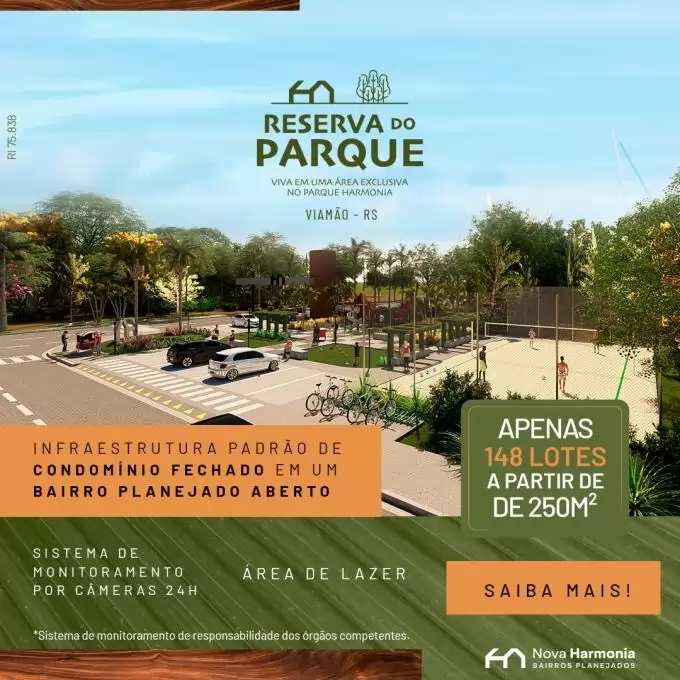 O Reserva do Parque está localizado em uma área Exclusiva do Parque Harmonia. Oportunidade para seu cliente conhecer o melhor bairro de Viamão, com as melhores condições de negociação (sem comprovação de renda, sem consulta ao SPC/Serasa) e o único com Stok Center na entrada do bairro