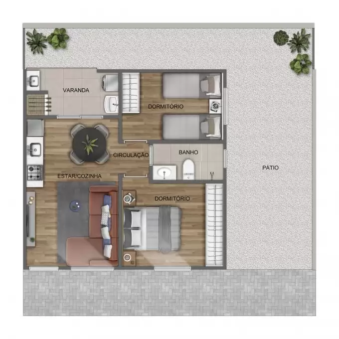 REFERENTE A CASA 34 - 2D 2 DORMS. até 85m2 privativos* Varanda com churrasqueira Uma vaga de garagem *A metragem privativa de cada unidade habitacional varia entre 75m2 e 85m2 , de acordo com o tamanho do pátio de cada unidade